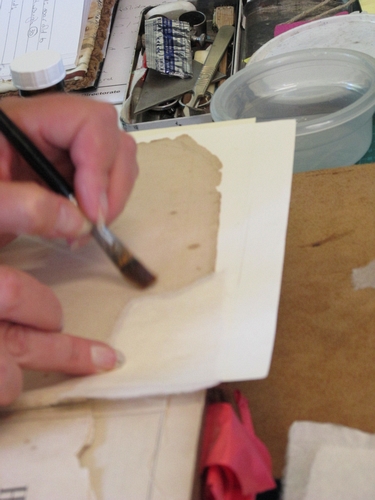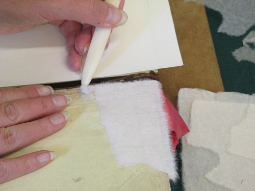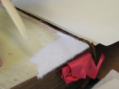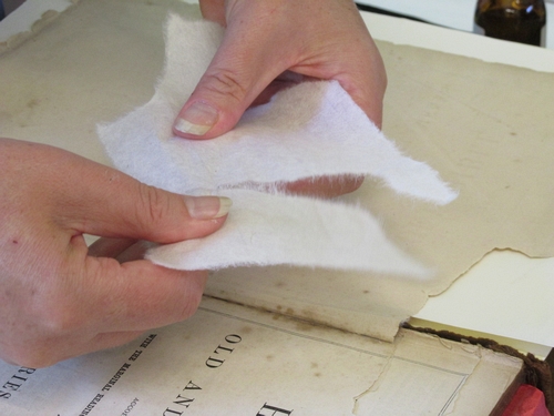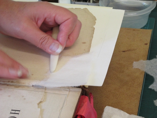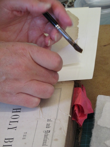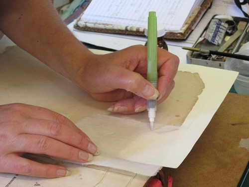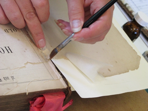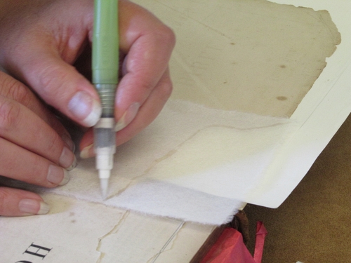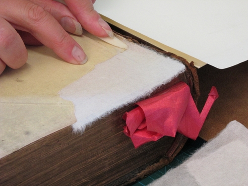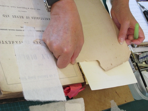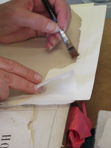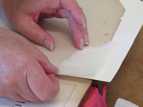 Helen carefully repairs a damaged page corner using fine Japanese handmade paper.